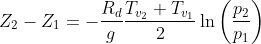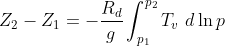 $$ Z_2 - Z_1 = -\frac{R_d}{g} \int_{p_1}^{p_2} T_v d\ln p $$