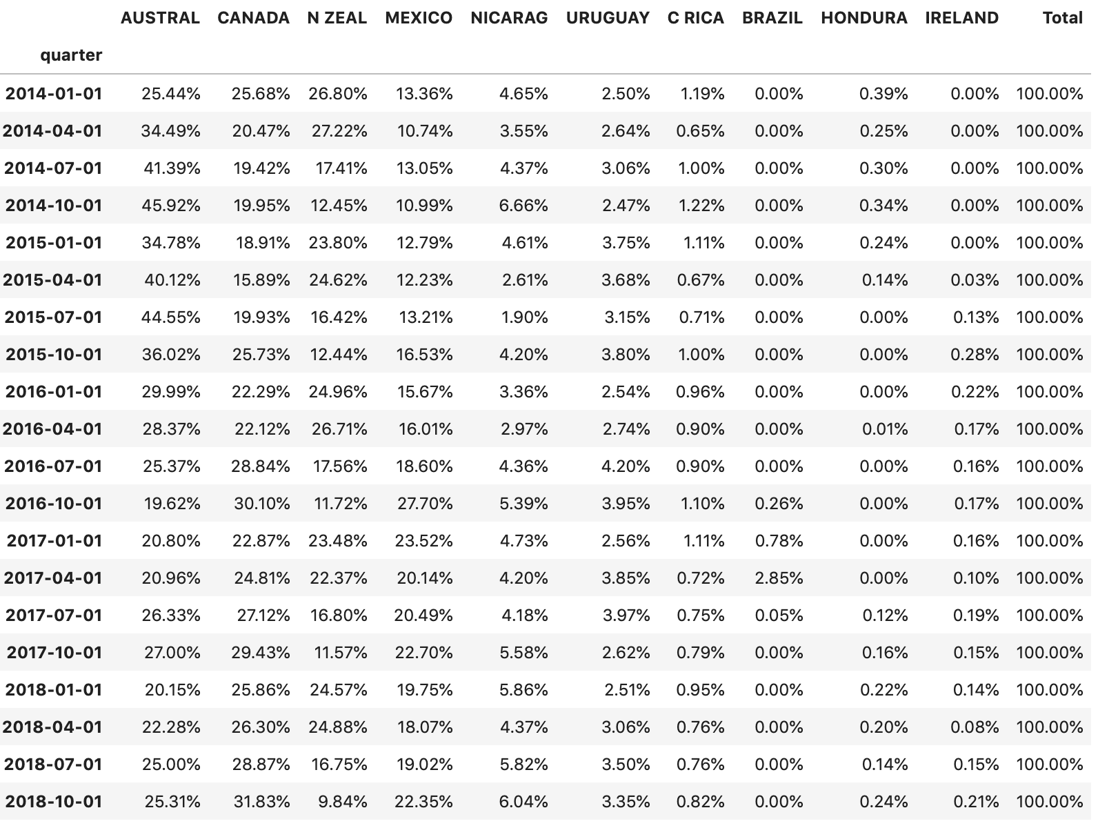 normalize='index').applymap('{:.2f}%'.format)我期待着表格数据的百分比,其中每个国家的百分比按时期分列。我不知道为什么,在我的尝试,我没有得到正确的总和和预期百分比表。有人能指点我吗?有什么快速的解决办法吗?