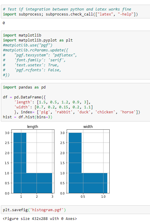 下面是为PGF禁用matplotlib配置的示例。显示了绘图,但是生成的histogram.pgf文件是空的