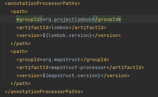 我认为您应该在文件中重新订购、、lombok、和mapstruct依赖项,这样就可以了。