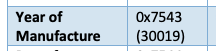Year of Manufacture0x7543 = 3001912019 (使用免费主modbus模拟器验证)。