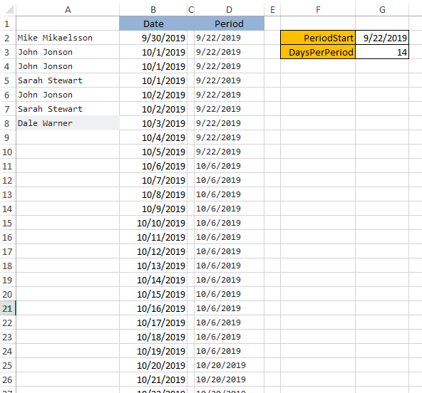 "DaysPerPeriod" = G3公式本身计算出当前日期(在B列中给出)到所有期间(单元格G2或"PeriodStart")开始之间的天数,并计算自所有日期周期开始以来已经过了多少天。