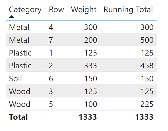 #"Changed Type"你想要的可能是按类别计算总数。如果将“类别”和“行”(或日期,要运行“总计”的内容)放在表中,则此DAX代码将起作用。