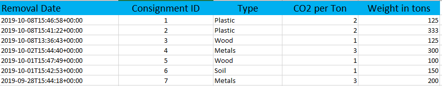 我有一个问题,我似乎不能用简单的方式解决,只是一个过于复杂的方法。基本上,我在一张桌子上有两列。在一个列中有一个废物参数/类别(混凝土、塑料、木材等)。另一个是对应于每个类别(1.356、1.009、3.5等)的CO2值。废弃物参数与具有相应日期的特定“交付”废物相关,这两个日期都是表中的列(但我认为我只需要使用交付日期列)。