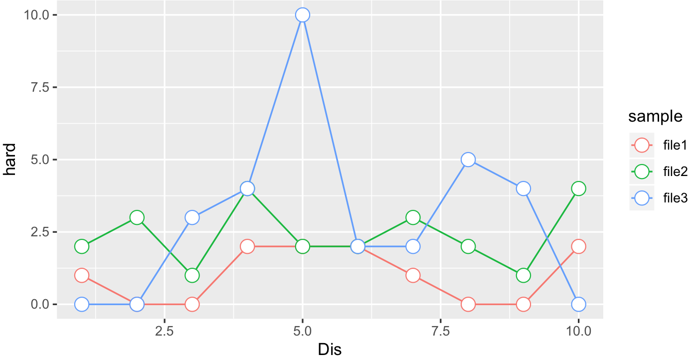 ggplot(data=df, aes(x=Dis, y=hard,col=sample)) + geom_line() +