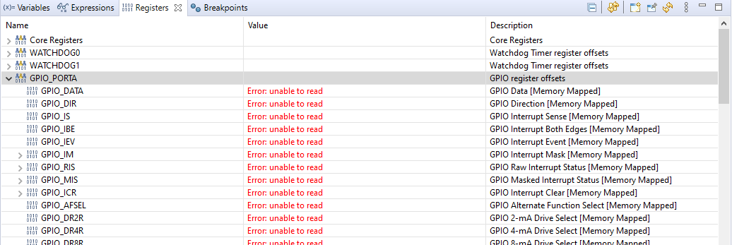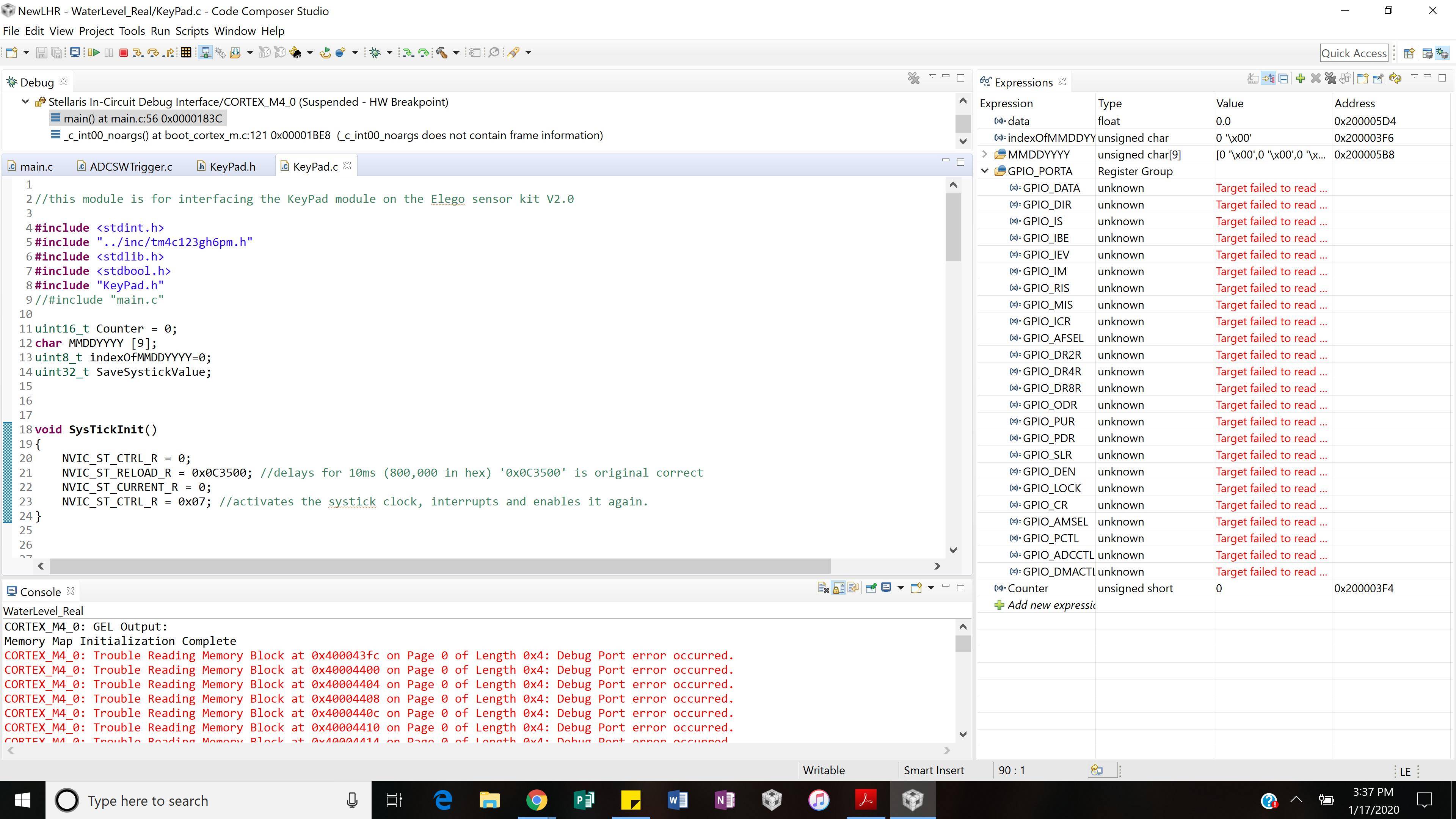 我使用的是德州仪器的TM4C123GXL发射台,它通过USB电缆连接到我的笔记本电脑。我可以成功地构建我的程序,但是每当我尝试调试我的程序时,错误就会出现。我的程序应该使用SysTick中断来不断地改变Elegoo膜开关模块上的电压,以允许程序查看我按的是哪个按钮。我不能100%确定我是否正确地初始化了GPIO输入和输出端口,但是这些错误发生在程序甚至启动并到达我的主循环之前。