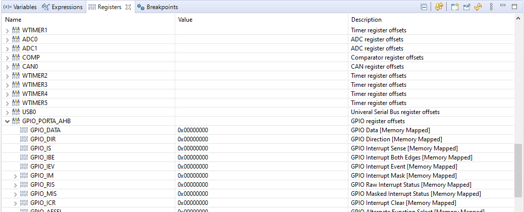 在我的例子中,我不得不禁用GPIOHBCTL寄存器中的AHB (高级高性能总线)来读取GPIO_PORTx寄存器。如果要在激活AHB时读取寄存器,则必须读取GPIO_PORTx_AHB寄存器。