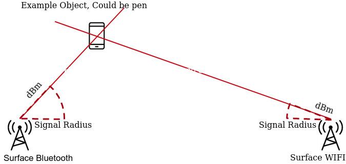 我可能有解决方案,将与目前使用的技术,如蓝牙和Wifi,是在笔和您的微软表面。但是,您需要自己编写一些部分的程序(大多数提到的技术都在开源库中)。