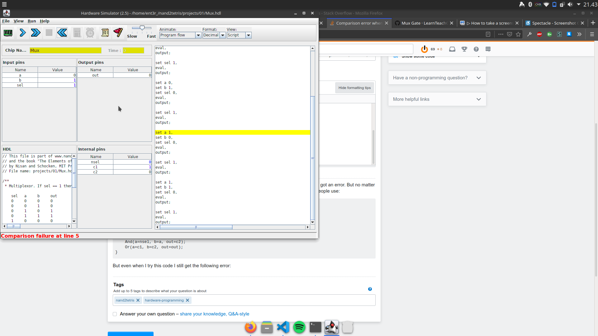 1)没有加载正确的Mux.hdl,因为如果计算Or(c1,c2),就会得到1,这是正确的。如果您将And门替换为Or,它将解释故障。