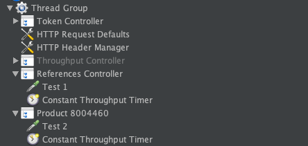 所有请求都在同一个线程组中。由于测试计划中没有逻辑控制器,所以请求被一个接一个地执行。当将常量吞吐量计时器作为子请求引入请求时,如果服务器能够处理,JMeter将尝试创建请求以保持指定的吞吐量。