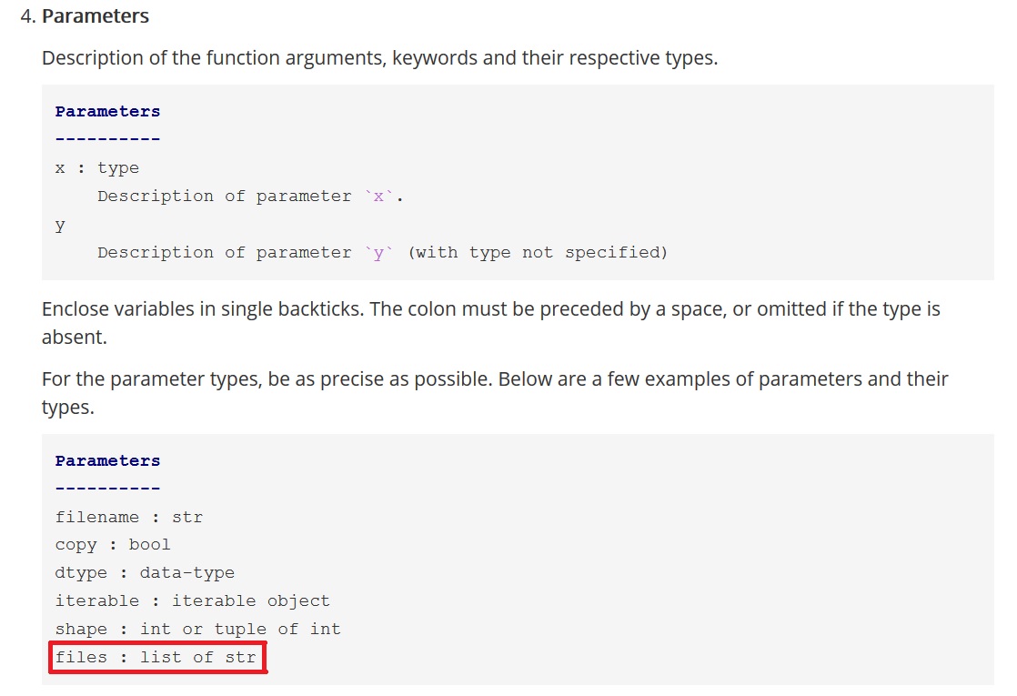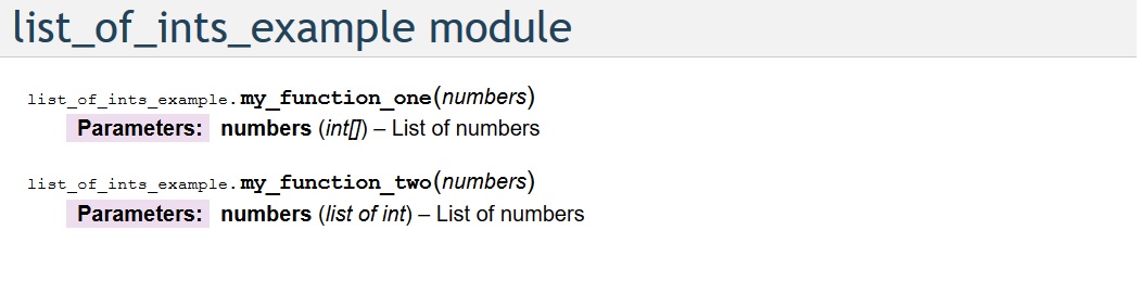 根据numpydoc文档字符串指南的说法,在章节-4下,您可以找到一个关于如何记录list of str的示例,所以只需将其更改为list of int即可。
