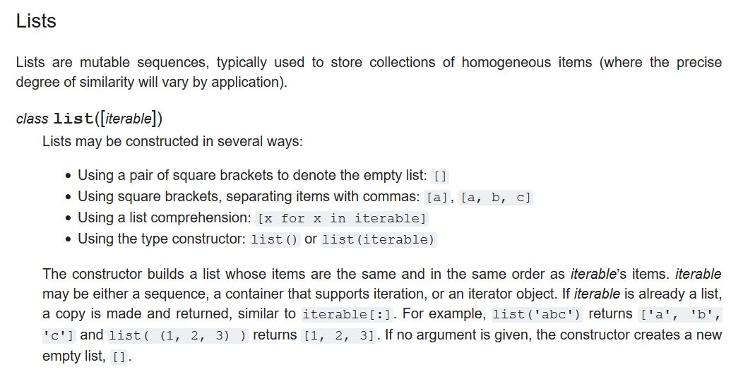 之所以显式地将其记录为list of int类型而不仅仅是int [],是因为python中的方括号 [] (通常称为“数组索引”)表明可以对对象进行索引、切片和迭代。方括号语法本身并不区分是处理数组还是处理列表,除非最初实例化对象。正如python所指出的,带有list([iterable])构造函数的方括号表示括号内的对象只能是可迭代的。