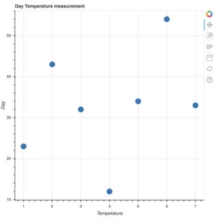 从bokeh.plotting进口散射图,output_file显示进口熊猫df=pandas.Dataframe(colume"X","Y") df"X"=1,2,3,4,5,6,7 df"Y"=23,43,32,12,34,54,33 p=Scatter(df,x="X",y="Y",title=“日温度测量”,xlabel=“温度”,ylabel="Day") output_file("File.html")显示(P)