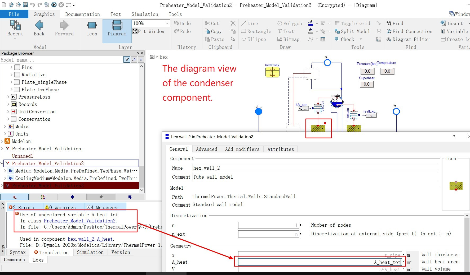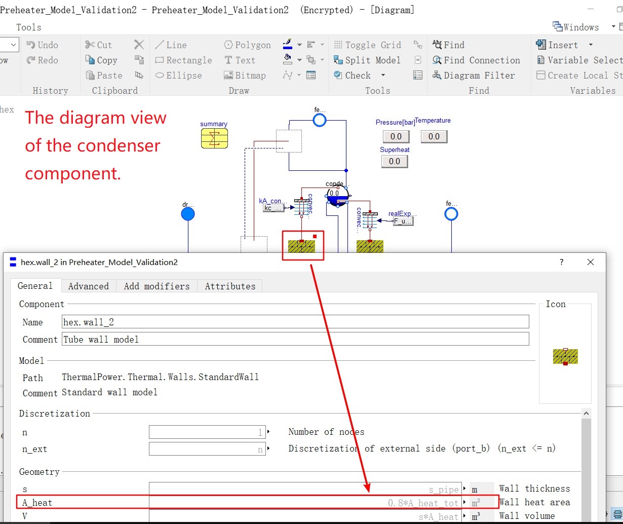 我正在使用来自Modelon的热能库。火电库中有一个冷凝器组件,用于发电厂的建模。冷凝器部件中的wall_2的默认传热区域是0.8*A_heat_tot,A_heat_tot的变量是冷凝器部件中的内部变量,但是当我尝试使用该变量时,会出现一个错误,表明没有定义该变量。