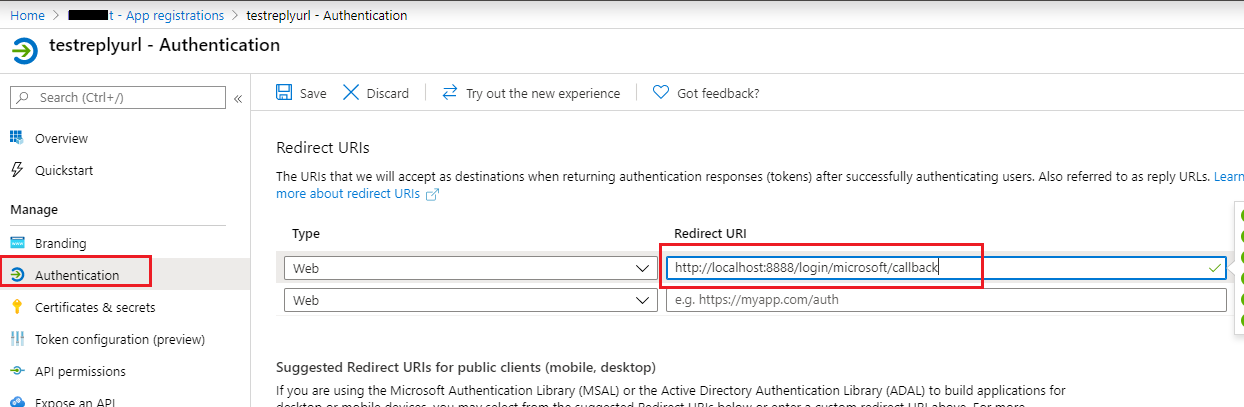 转到Azure门户->App注册->找到您的应用程序->Authentication->添加重定向URI。