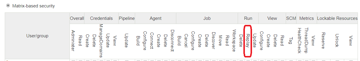 public static final Permission REPLAY = new Permission(Run.PERMISSIONS, "Replay", Messages._Replay_permission_description(), Item.CONFIGURE, PermissionScope.RUN);https://stackoverflow.com/questions/59665635
