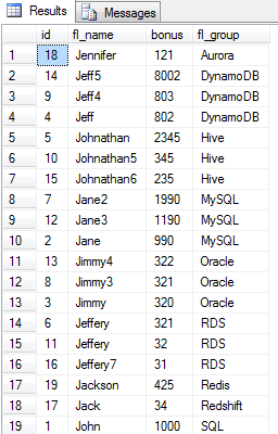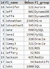 insert into Freelancer (id, fl_name, bonus, fl_group) Values (19, 'Jackson', 425, 'Redis')例如,在DynamoDB组,Jeff5(8002)和Jeff4(803)将被选中。