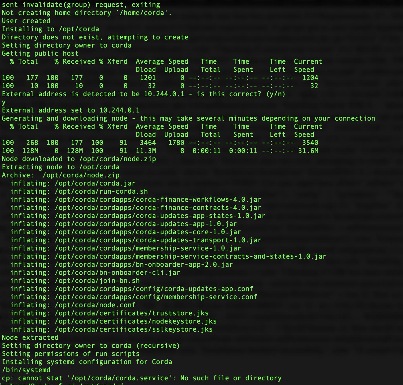 我假设您是在讨论最后一行(No such file or directory),因为我没有看到任何真正的错误。因此,如果VM缺失,corda.service文件允许您在VM启动时启动Corda节点;然后必须手动启动该节点。