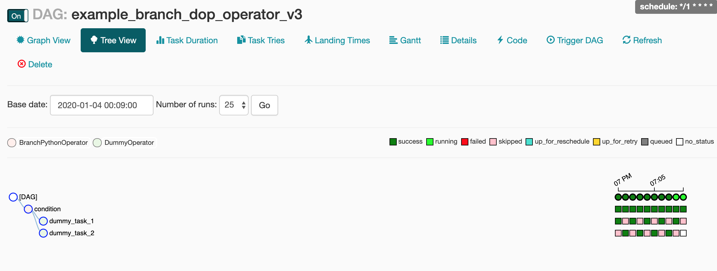 cond >> [dummy_task_1, dummy_task_2]由于depends_on_past是真的,我本来可以预料到,在第一个DAG运行之后,任务就不能再开始了。每个任务将查看前一个任务的状态,并看到它是skipped,这是不成功的,本质上没有状态挂起。