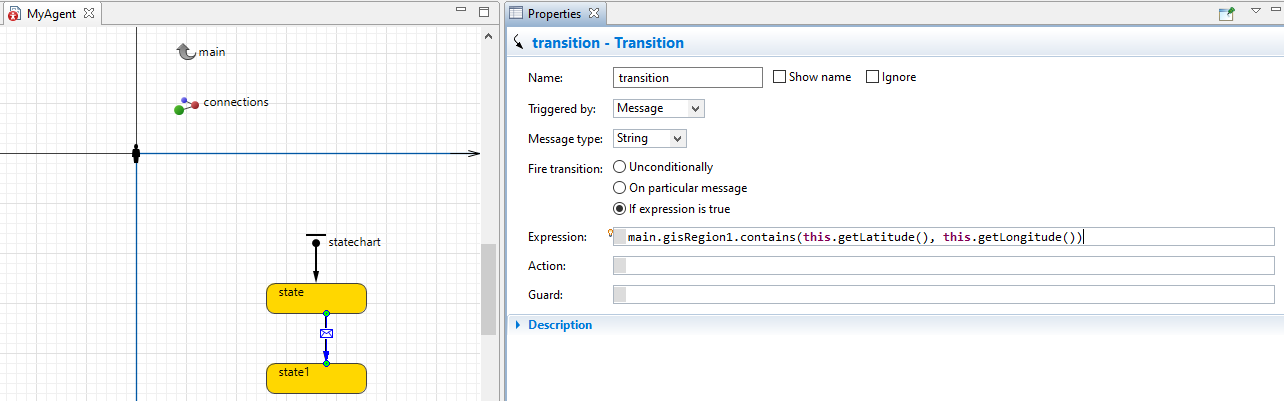 您可以在代理的状态转换中筛选消息,以便只在某个表达式为真时(在您的示例中:代理位于正确的区域)执行转换。