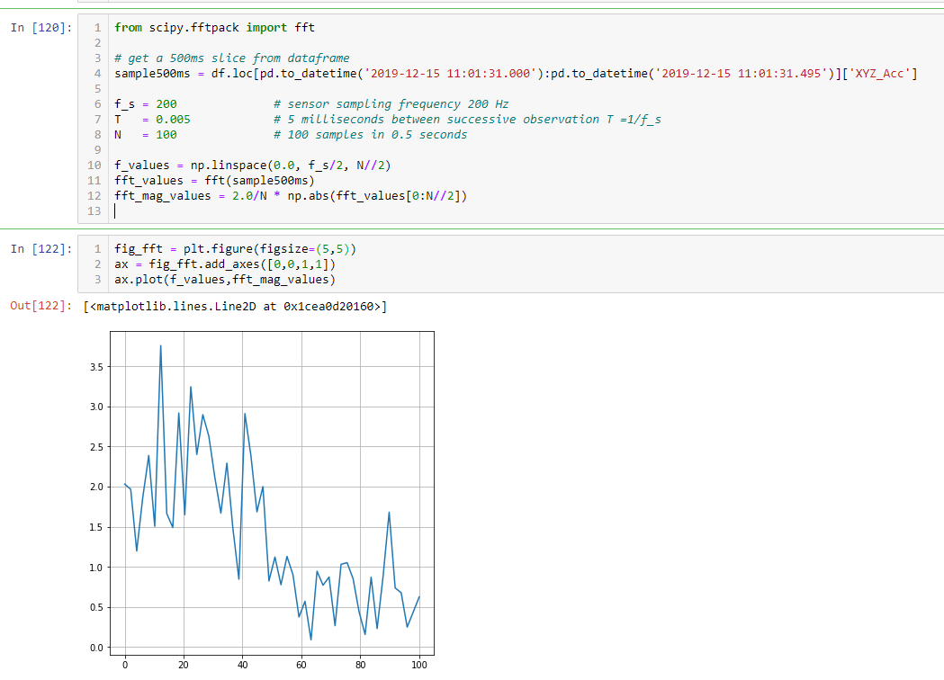 我正在收集数据,从X,Y和Z加速度传感器采样在200赫兹。3轴被组合成一个叫做'XYZ_Acc‘的单一信号。我学习了关于如何使用库将时域信号转换为频域的教程。