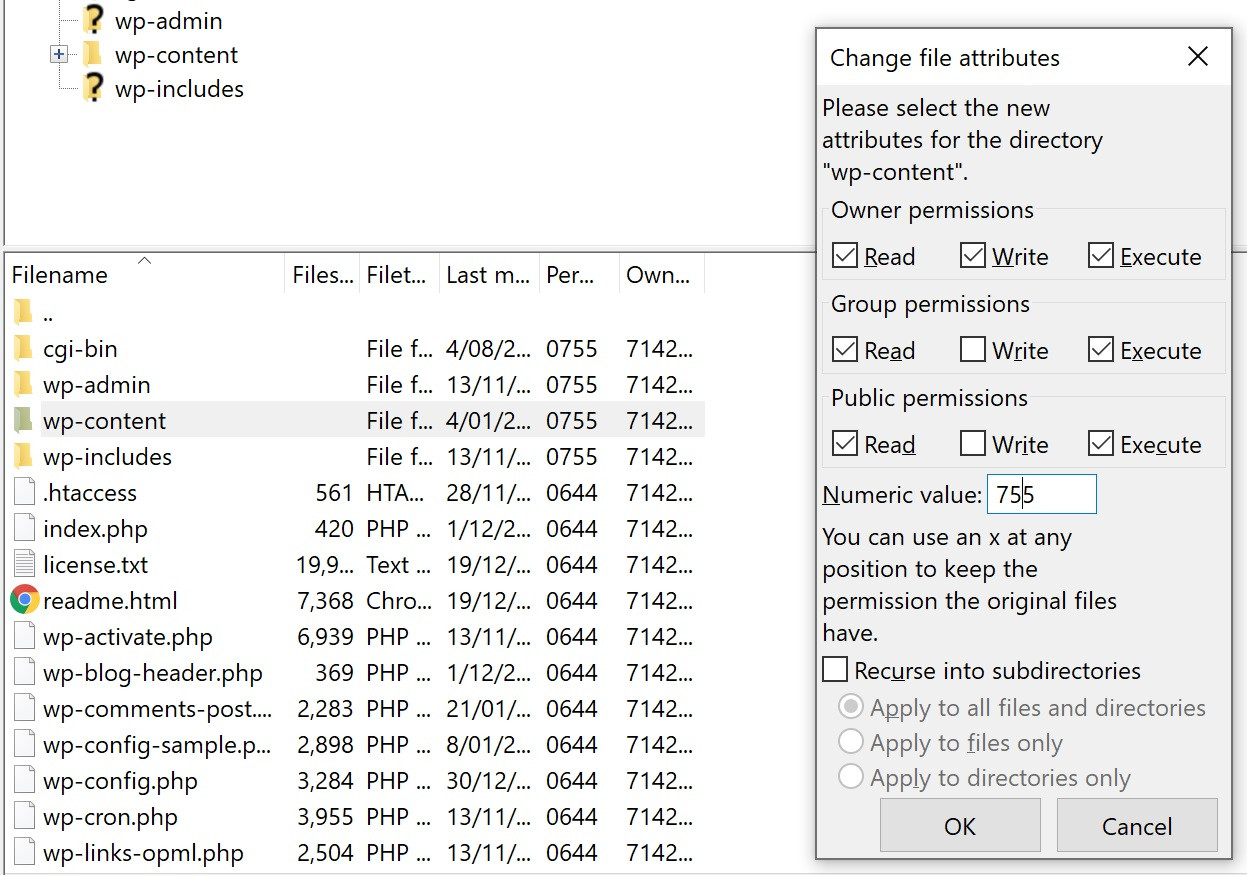 右键单击wp-content,选择File Attributes,并设置Numeric value: 755。