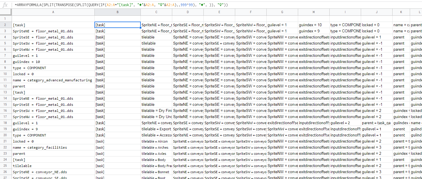 我在那里发现了很多有趣的资源,但似乎没有什么是针对使用行号的,甚至是只允许使用ARRAYFORMULA (并通过单次连接或类似调用避免了50,000个字符限制的问题)的拆分+连接类型方法。