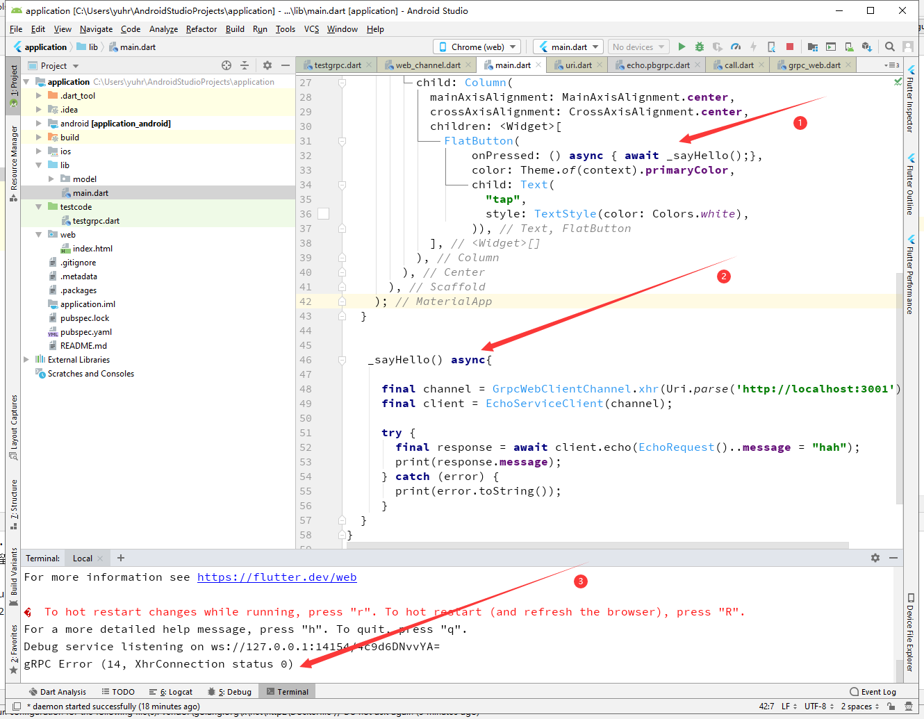 我试图将gPRC集成到flutter-web中,但始终失败。我不知道我的代码是否有问题,或者GRPC不能集成到颤振的web中。