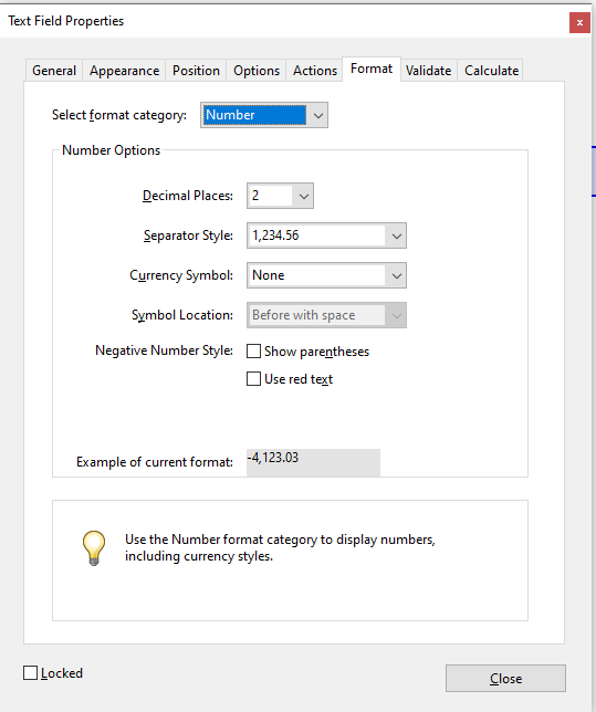 PdfAction validation = PdfAction.createJavaScript("AFNumber_Format(2,0,0,0,\"\", true);");