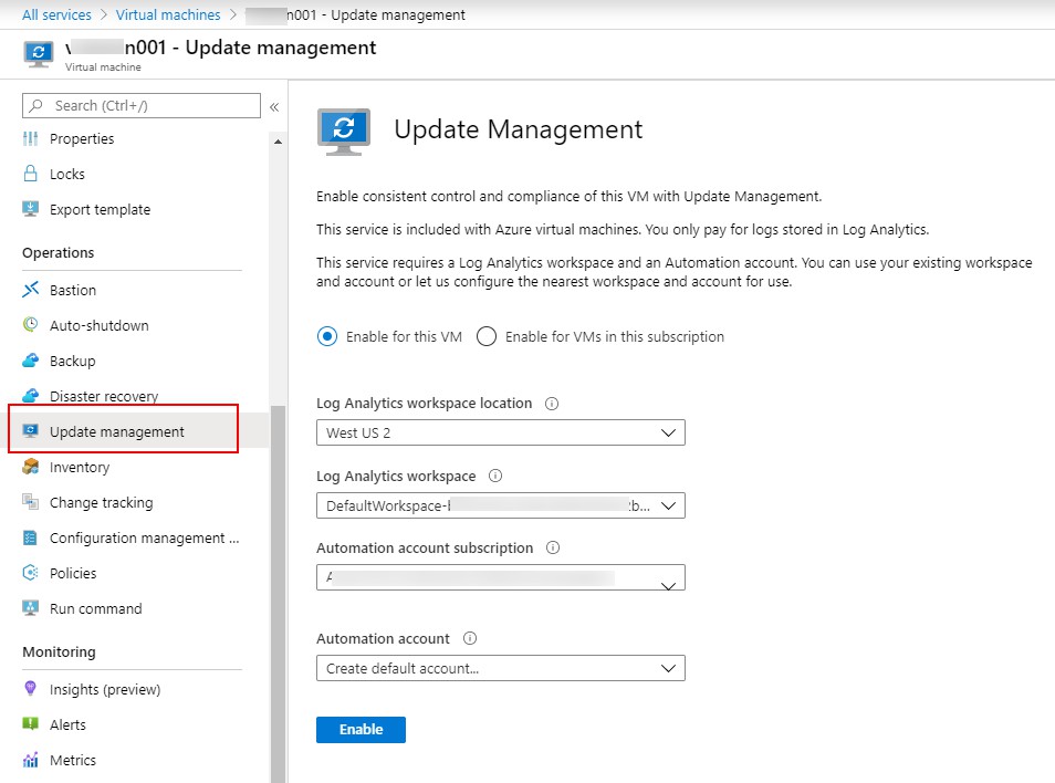 我想在我的Azure DevTest实验室虚拟机上启用自动修补,但是我无法在操作下看到更新管理。