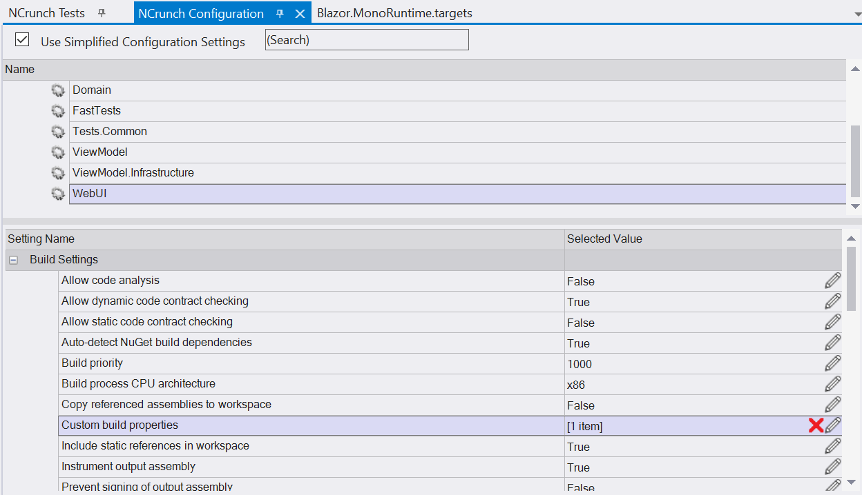 </PropertyGroup>这就是为什么将BlazorWebAssemblyEnableLinking)设置为BlazorLinkOnBuild (从3.2.0-preview 3开始,重命名为BlazorLinkOnBuild)允许NCrunch构建项目的原因。