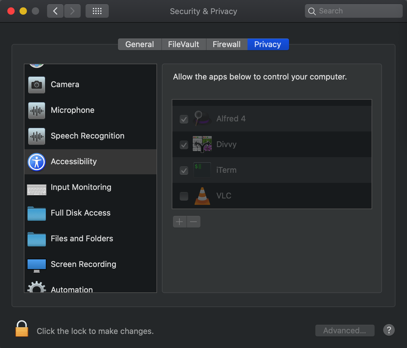 defaults read com.apple.AppleMultitouchTrackpad但是我很难找到完整的磁盘访问、文件和文件夹,以及安全与隐私下的可访问性。