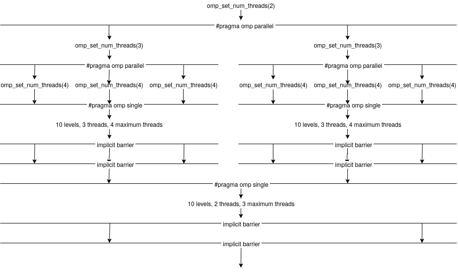 下图说明了线程的流程。您的输出可能不正确,我不能用clang+libomp或gcc+libGOMP复制它。