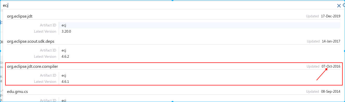 其他组中的工件可能错误地使用了Eclipse发行版的版本号,而不是ecj本身的版本号,因此即使它们(很老)也显得更新。