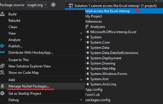您可以尝试安装Nuget包Microsoft.Office.Interop.Excel form Nuget Package Manager。首先,右键单击项目并选择Manage NuGet Packages...。