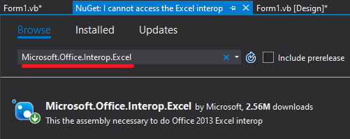 然后在搜索栏中键入Microsoft.Office.Interop.Excel并安装它: