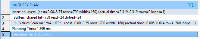 CREATE TABLE IF NOT EXISTS layers (ID NUMERIC, GEOM GEOMETRY, CITY VARCHAR, AGGREGATION_METHOD VARCHAR, INFO JSON);我将尝试用以下一个查询将~700记录插入到该表: