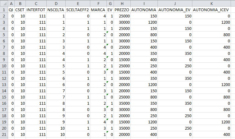 在INTERTOT栏中,每个答复者都有一个编号。第一个答辩人的号码是111号。有20行对应于这个人,因为他面临10种选择的两辆车,一辆电动和一辆汽油。在列SCELTAEFF2中,等于1的值表示个人执行的选择。这样的值必须与EV栏中报告的值进行比较,其中值1表示这条线路中的选项是电动汽车。