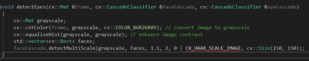 faceCascade.detectMultiScale(grayscale, faces, 1.1, 2, 0 | CV_HAAR_SCALE_IMAGE, cv::Size(150, 150));
