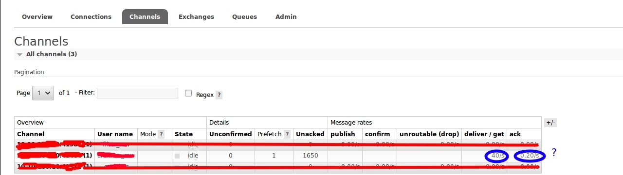 init()因此,我的问题是,为什么rabbitmq发送的文档(40/秒)比确认的(0.20/秒,更正,因为暂停5秒)更多。这两者不应该是平等的吗?此外,Unacked (1650)不应该大于1,因为它不应该传递任何文档,直到这个文档被认可为止。