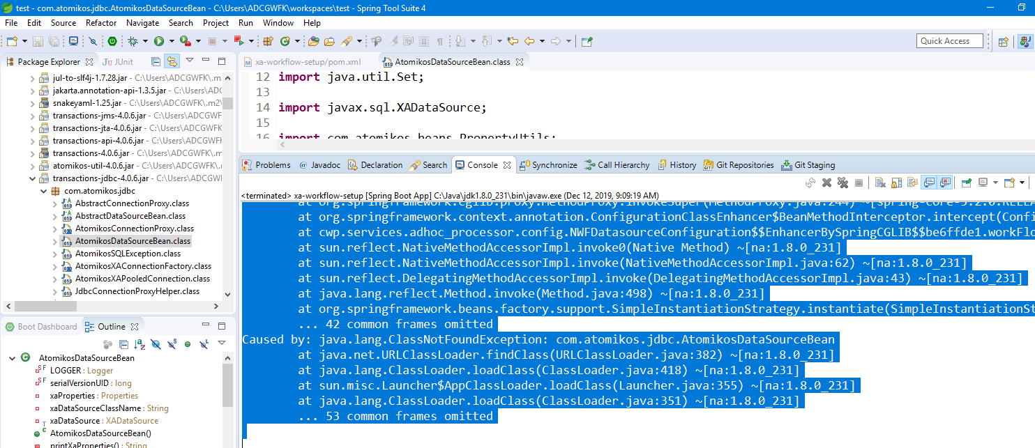 org.springframework.beans.factory.UnsatisfiedDependencyException: Error creating bean with name 'taskDatasourceConfiguration': Unsatisfied dependency expressed through field 'dataSource'; nested exception is org.springframework.beans.factory.BeanCreationException: Error creating bean with name 'workFlowDataSource' defined in class path resource [cwp/services/adhoc_processor/config/NWFDatasourceConfiguration.class]: Bean instantiation via factory method failed; nested exception is org.springframework.beans.BeanInstantiationException: Failed to instantiate [javax.sql.DataSource]: Factory method 'workFlowDataSource' threw exception; nested exception is java.lang.NoClassDefFoundError: com/atomikos/jdbc/AtomikosDataSourceBean