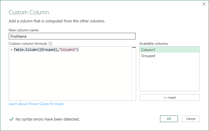#"Added Custom" = Table.AddColumn(#"Grouped Rows", "FirstName", each Table.Column([Grouped],"Column2")),