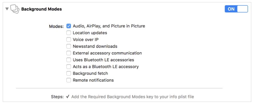 在xcode项目配置中,转到"Capabilities“选项卡,并选择"Audio、Airplay和Picture In Picture”。
