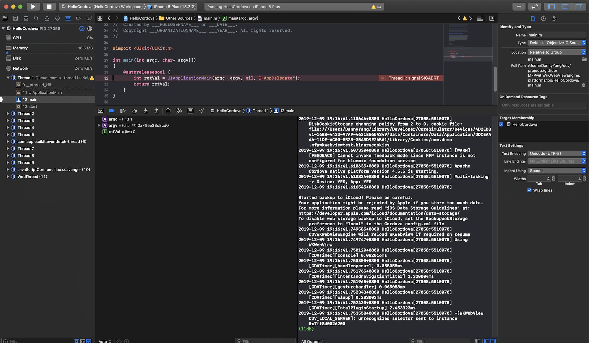 cordova-plugin-wkwebview-engine 1.2.1 "Cordova WKWebView Engine"该应用程序在模拟器中运行时兑现,错误消息如下所示