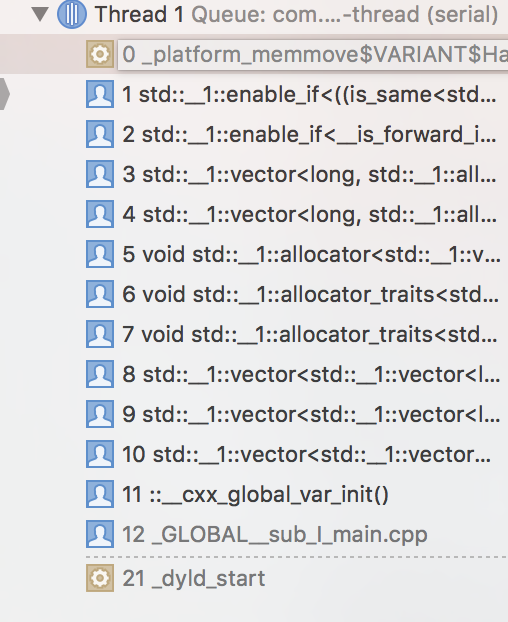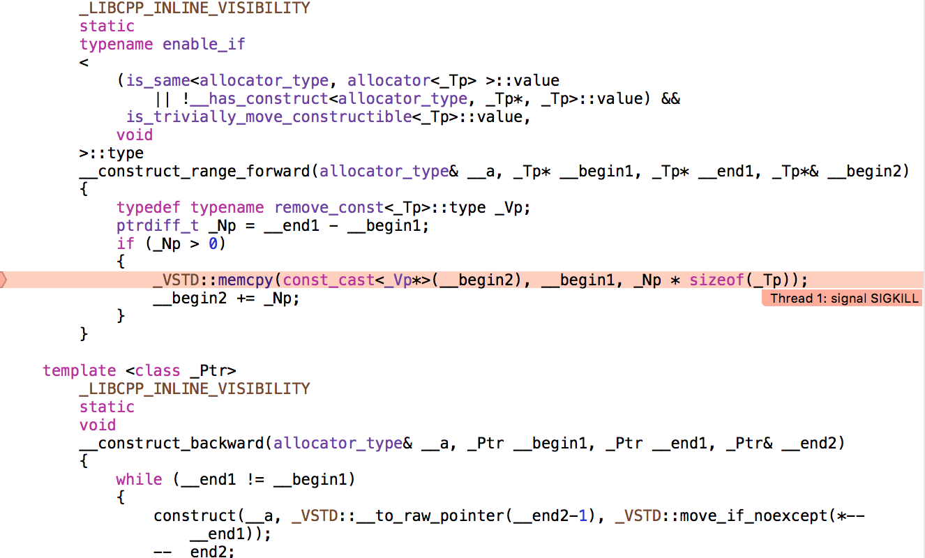 如果您在设置为停止异常的调试器下运行,您可能会看到一个std::bad_alloc被抛出,调用堆栈指示原因(例如,Visual将在调用堆栈中显示类似于“‘螺旋’的动态初始化器”之类的内容),但是在Linux上操作系统可能会首先关闭它,因为Linux可以过提交内存(因此new等),然后当某些程序使用内存(实际的读或写)时,它会失败(过度提交,没有任何空闲),并且SIGKILL会释放内存(这似乎不是完全可以预测的),我将您的代码复制到Ubuntu 18上,并在命令行上得到“在抛出‘std::bad_alloc’实例后终止调用”)。