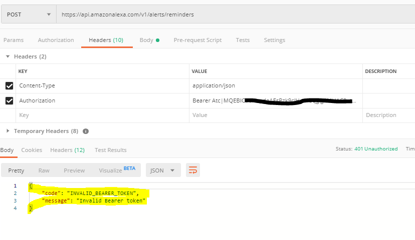 我正试图通过POSTMan发送警报/余数到我的技能。