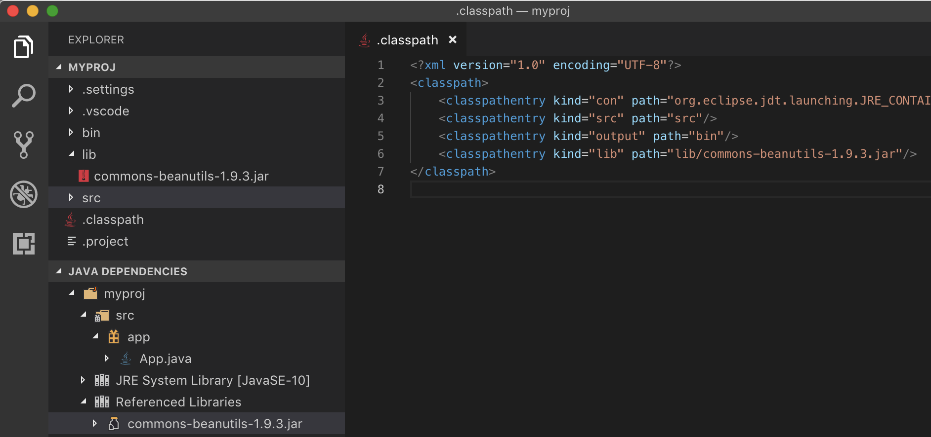 因此,现在您可以通过编辑.classpath文件来添加库,可以使用JAR的自定义条目,这些条目可以放在任何地方,例如lib文件夹。扩展将自动在类路径中加载这些库,您应该能够运行您的代码。