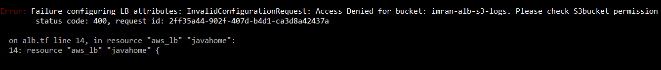 我正在尝试将一些terraform代码部署到我有管理访问设置的AWS环境中。此代码的目的是将日志从应用程序负载均衡器发送到S3桶中。代码能够在没有问题的情况下创建存储桶,但是当涉及到日志记录部分时,我会遇到以下错误: