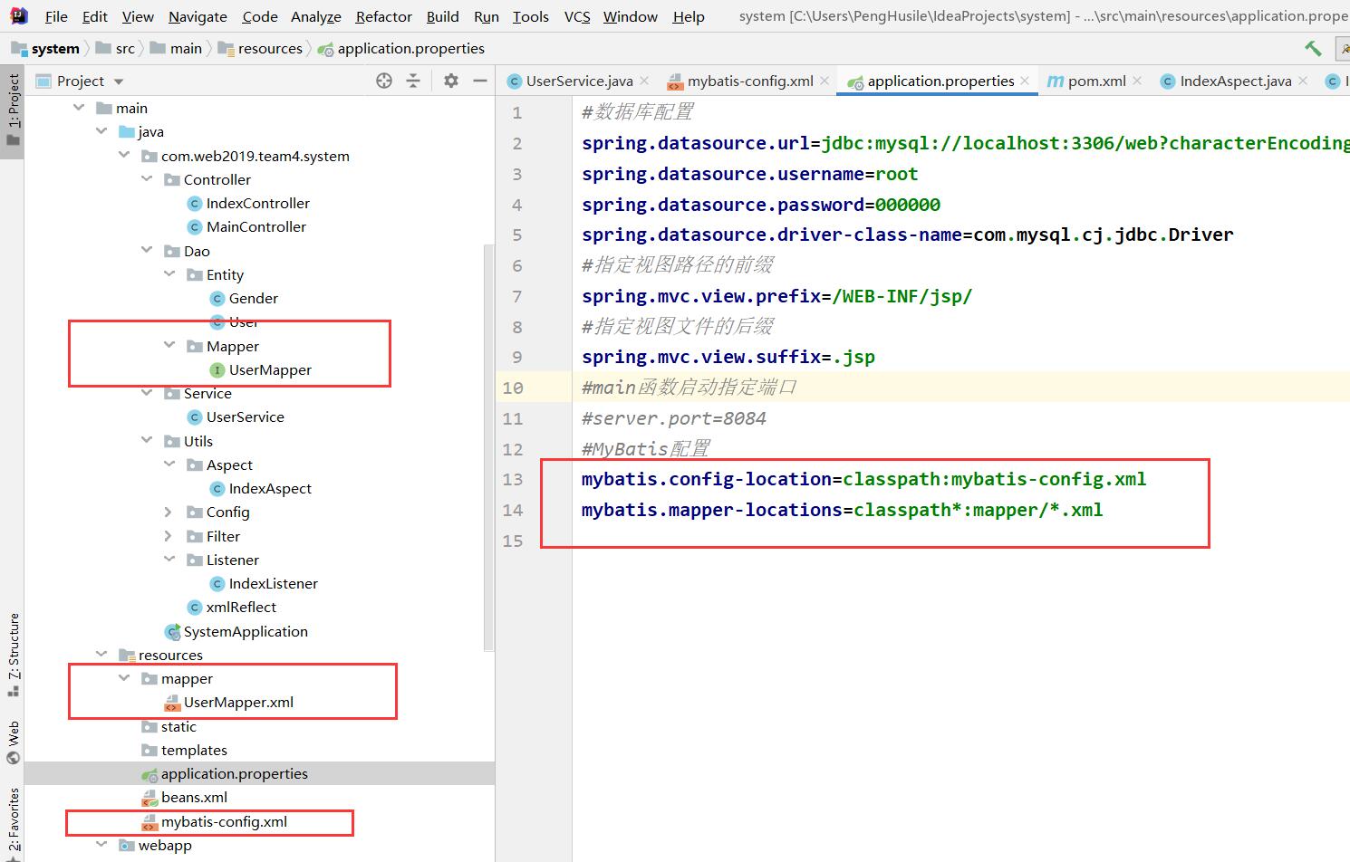 我的项目结构和属性中的mybatis配置: