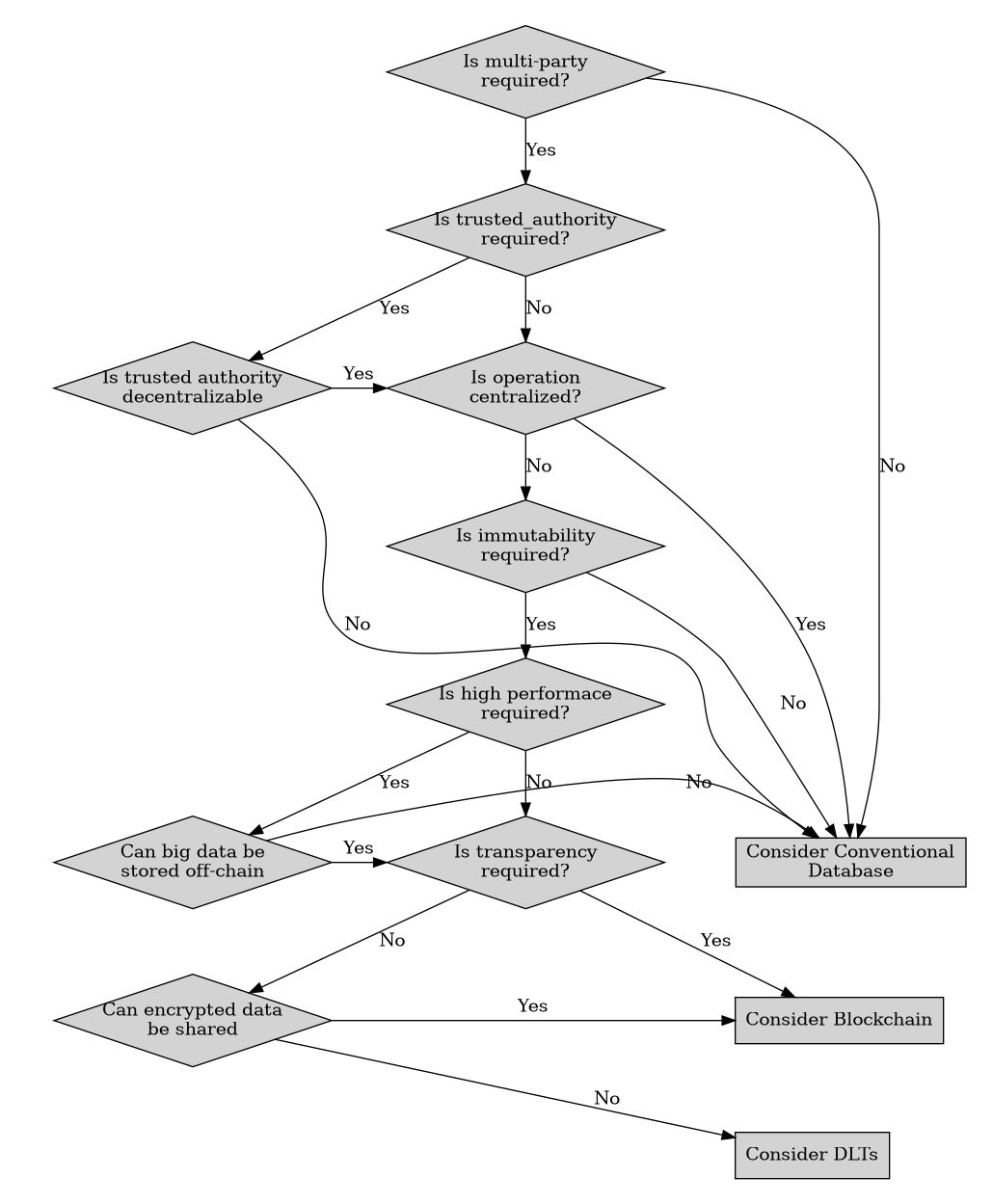 P [label="Is trusted authority\ndecentralizable", fillcolor=""]